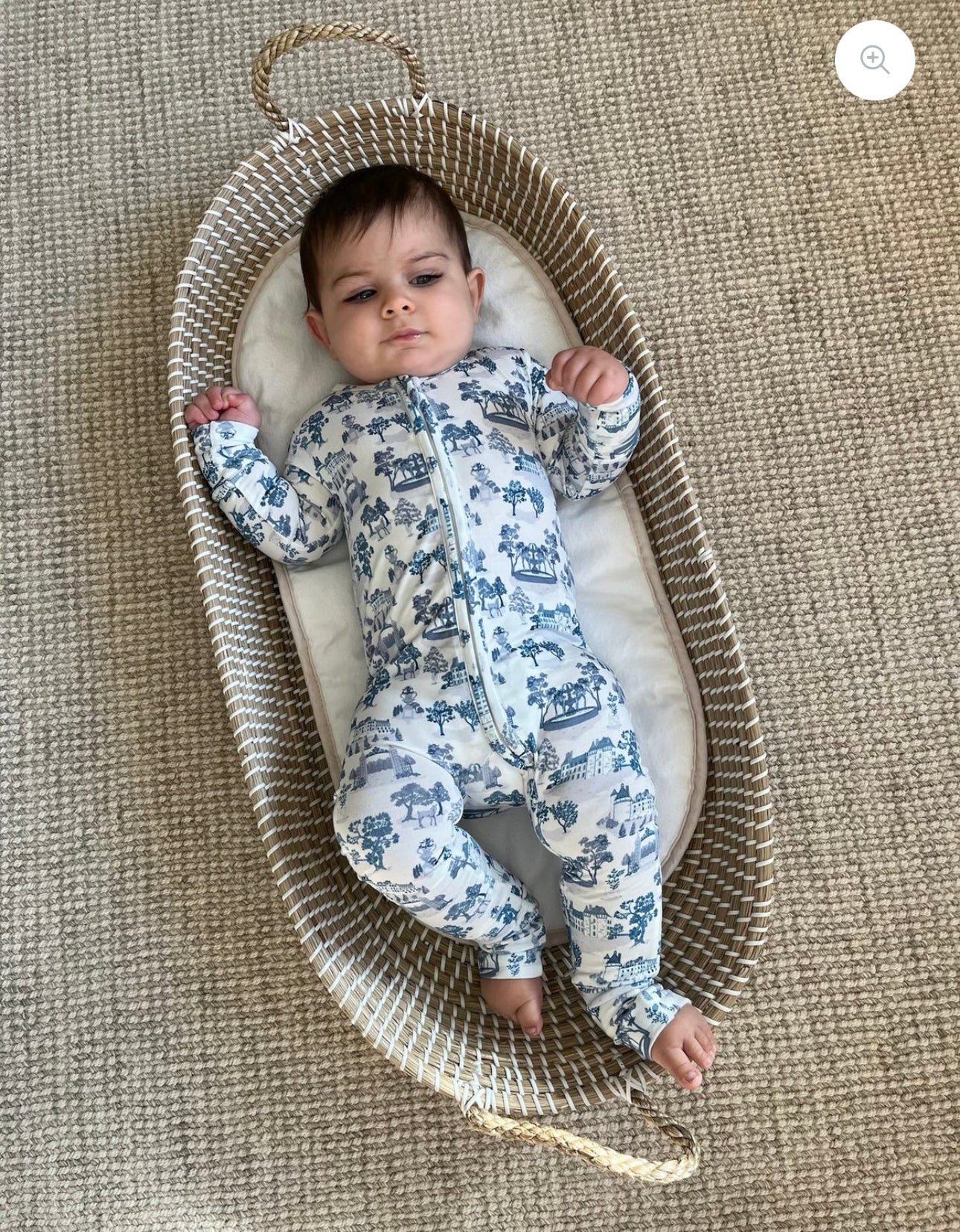 Little Threads Label - Blue Toile De Jouy Bamboo Wrap Footie